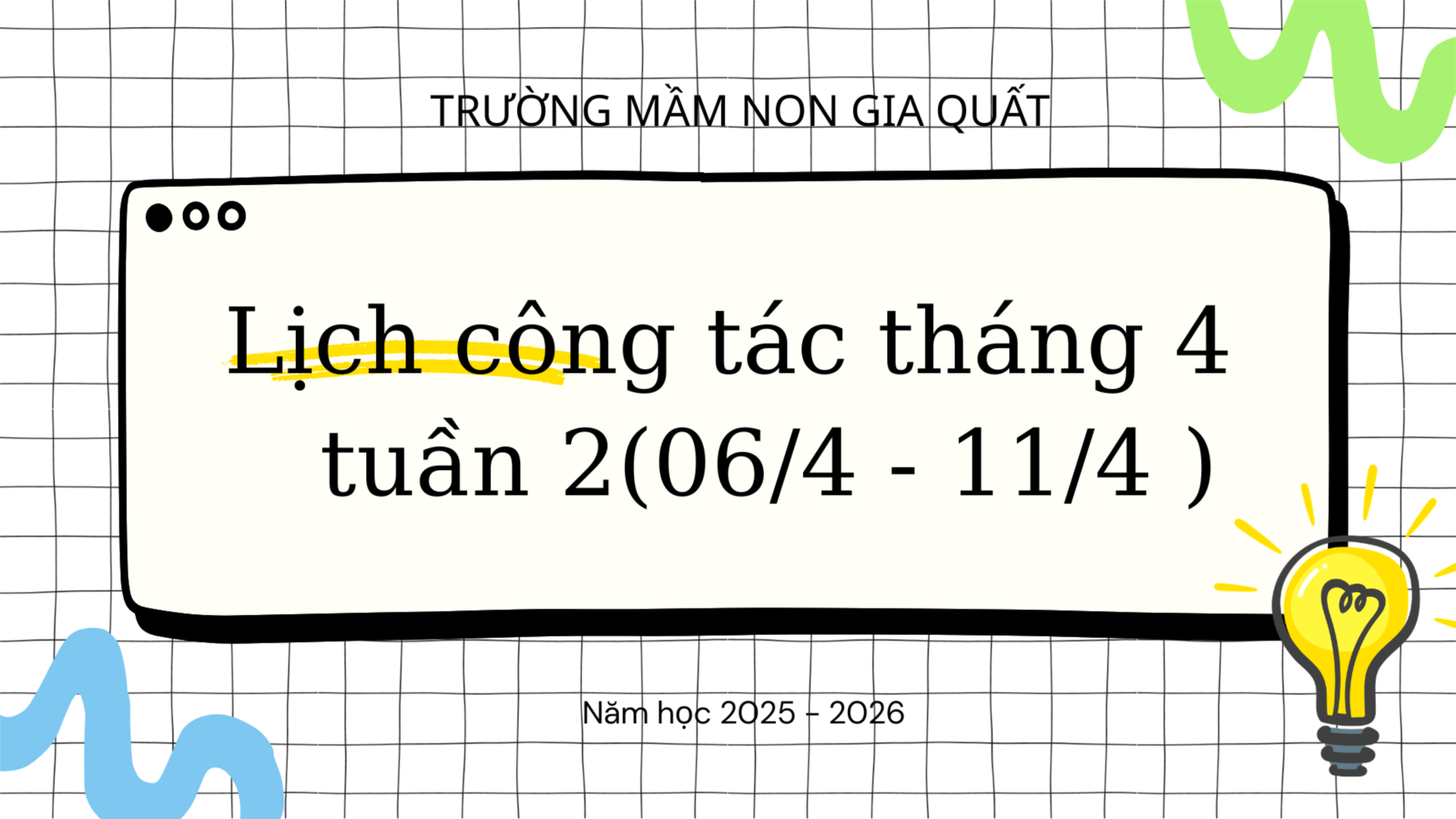 | C | - Họp giao ban BGH - Xây dựng dự thảo nghị quyết tháng 4/26 - Hỗ trợ lớp C1 | - Nhận xét bài soạn tháng 3.2026, rà soát giảm tải dữ liệu trang Website. - Kiểm tra công tác trả trẻ | - Kiểm tra công tác chuẩn bị chương trình “ Đồng hành hạnh phúc”của các bộ phận. - Làm việc tại phòng | - Kiểm tra công tác đăng bài trên website - Rà soát, hoàn thiện nội dung KTNB tháng 3/2026 | - Thực hiện tổng vệ sinh thứ 6 - Làm việc tại phòng |
