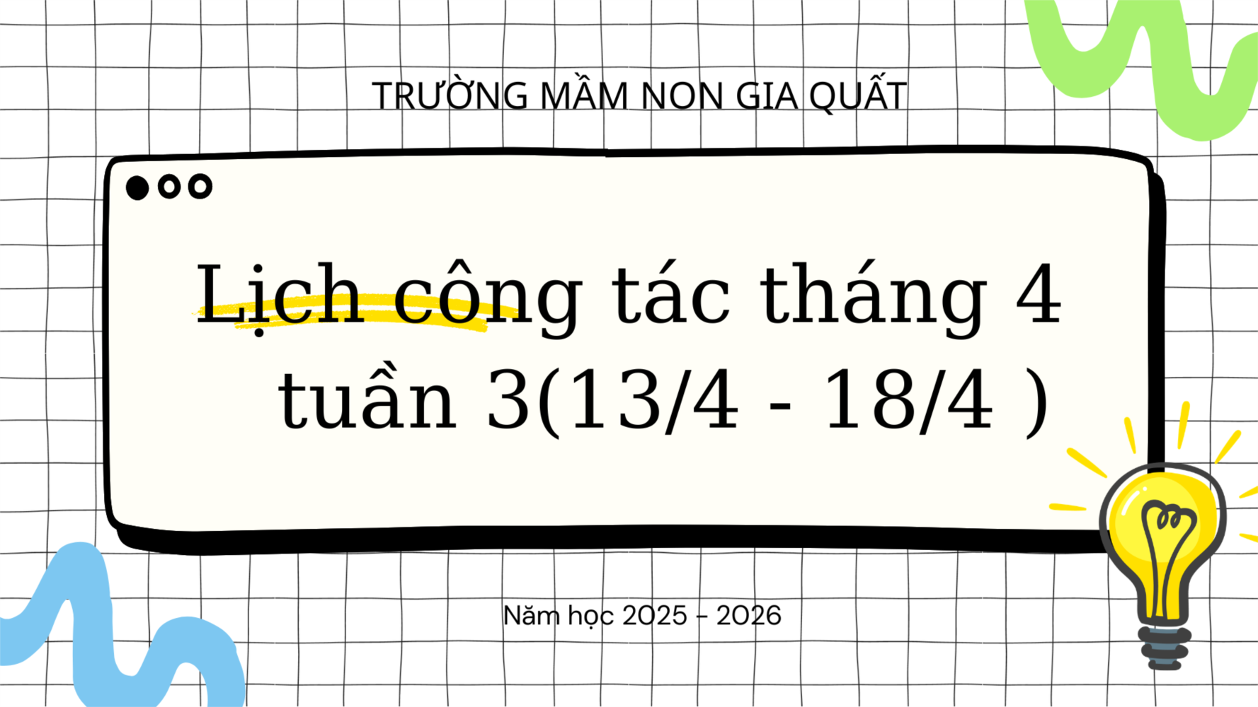 | C | - Hoàn thiện hồ sơ chấm CĐS năm học 2025-2026. - Xây dựng KH tổ chức liên hoan CCVK năm học 2025-2026 | - Kiểm tra website - Kiểm tra công tác hoạt động NK: Tiếng Anh - Thiết kế phông CCVK năm học 2025-2026 | - Làm việc VP. - Dự giờ ăn chiều khối MGL. - Kiểm tra công tác soạn bài, nhận xét T3/2026 | - Rà soát văn bản của Đảng qua phần mềm điều hành tác nghiệp - Kiểm tra giờ trả trẻ khối MGN | -Tổng vệ sinh toàn trường. - Tổ chức HĐC lớp A3 |