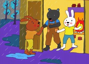 – Bác Gấu Đen đây ! Cho bác vào trú nhờ có được không ? Thỏ Trắng bước ra mở cửa.